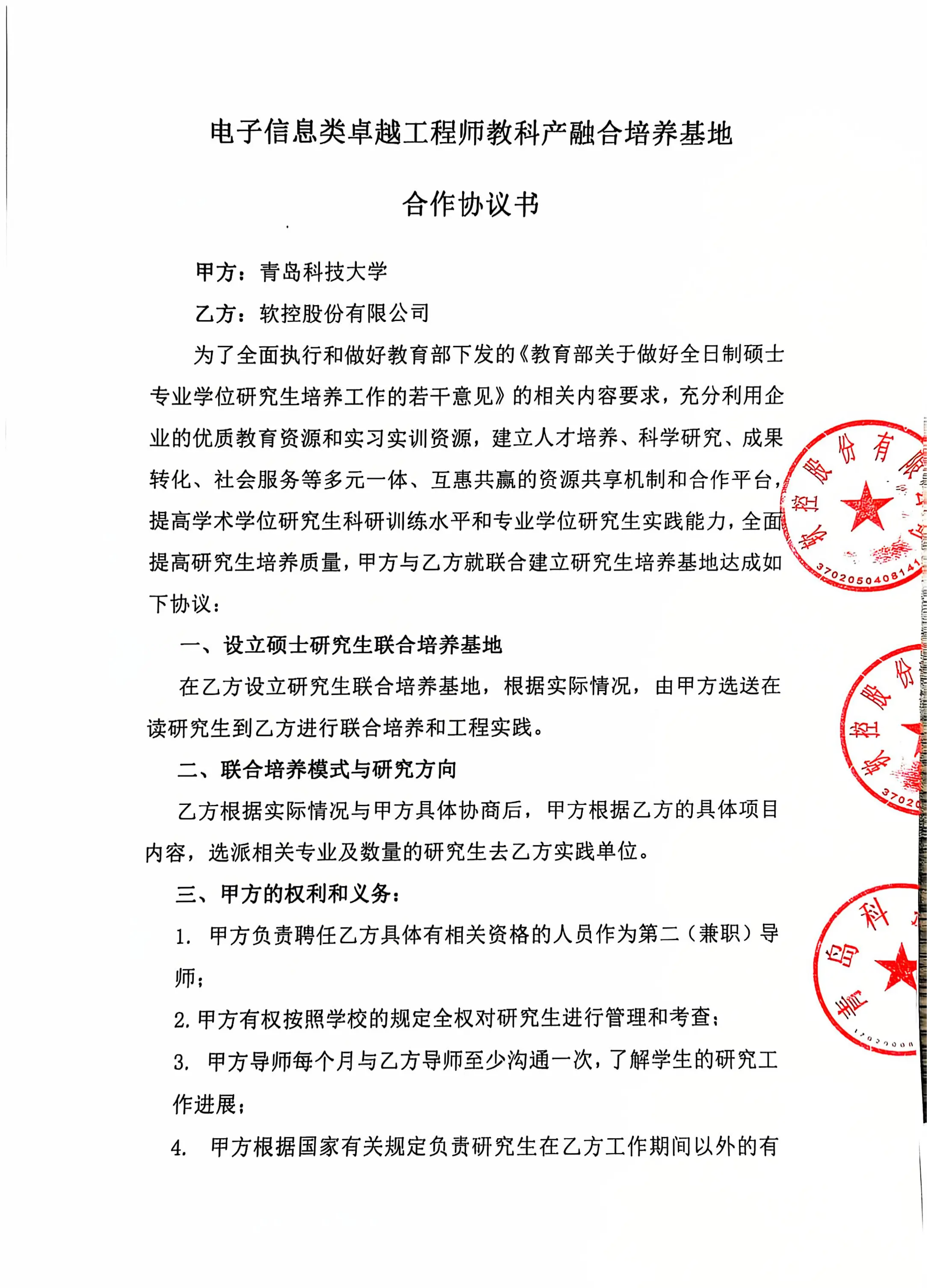 制度文件——电子信息类卓越工程师教科产融合培养合作协议书