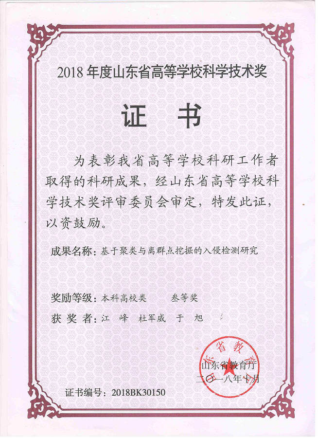 科研获奖-2018年度山东省高等学校科学技术奖三等奖-基于聚类与离群点挖掘的入侵检测研究