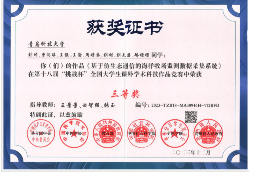 学生获奖——第十八届“挑战杯”大学生课外学术科技作品国家三等奖