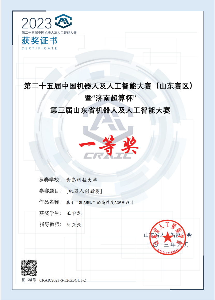 学生获奖——第二十五届中国机器人及人工智能大赛(山东赛区)暨“济南超算杯’第三届山东省机器人及人工智能大赛一等奖