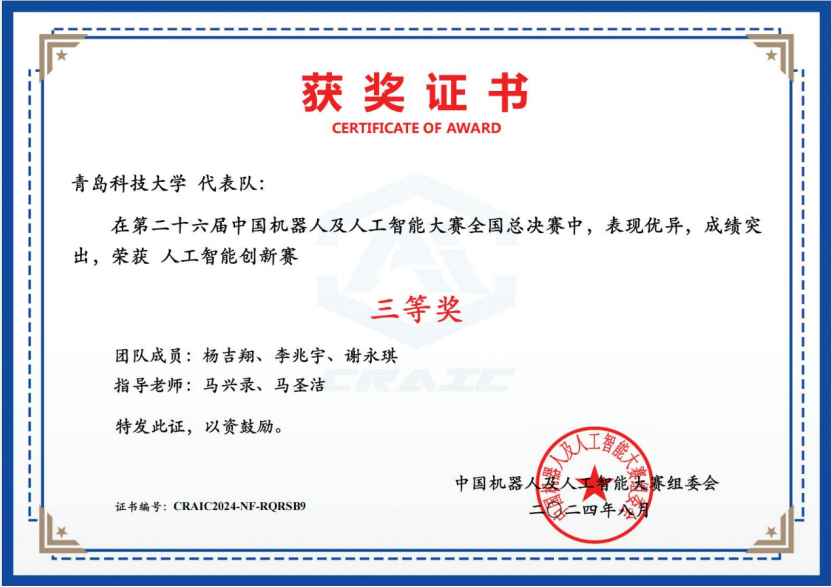 学生获奖——第二十六届中国机器人及人工智能大赛全国总决赛--工智能创新赛三等奖