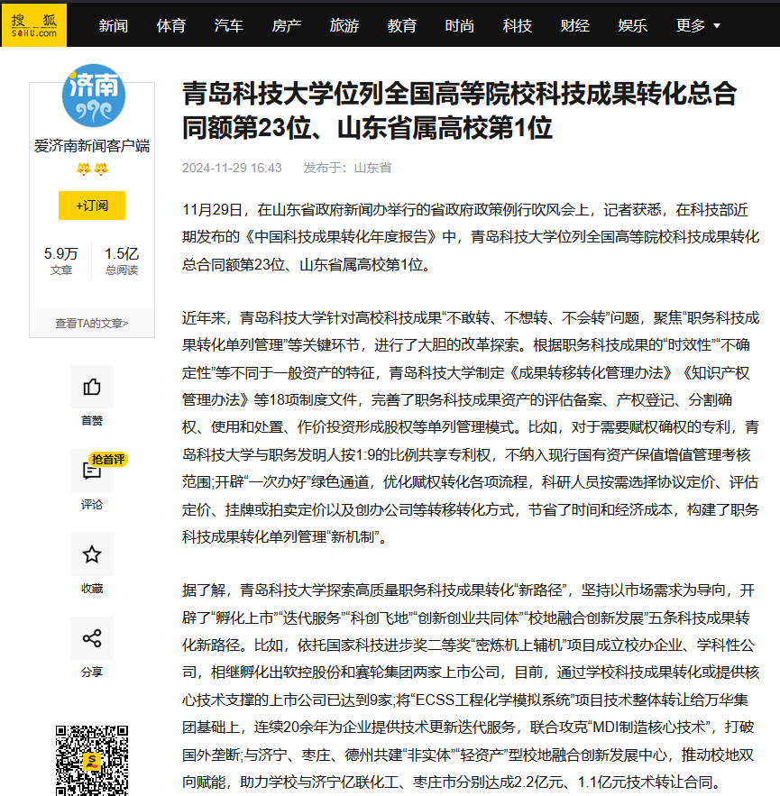 青岛科技大学位列全国高等院校科技成果转化总合同额第23位、山东省属高校第1位
